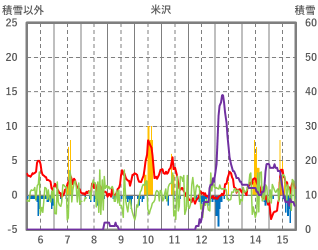 | 日 | 時 | 気温 | 降水 | 風向/風速 | 日照 | 積雪 | 降雪 |
