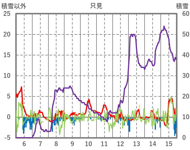 | 日 | 時 | 気温 | 降水 | 風向/風速 | 日照 | 積雪 | 降雪 |