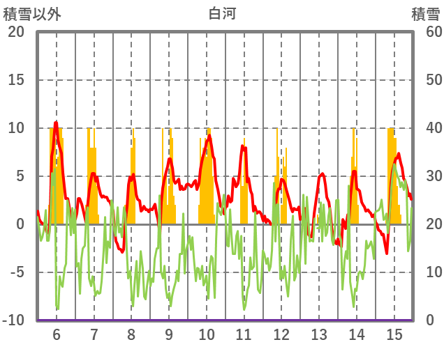 | 日 | 時 | 気温 | 降水 | 風向/風速 | 日照 | 積雪 | 降雪 |