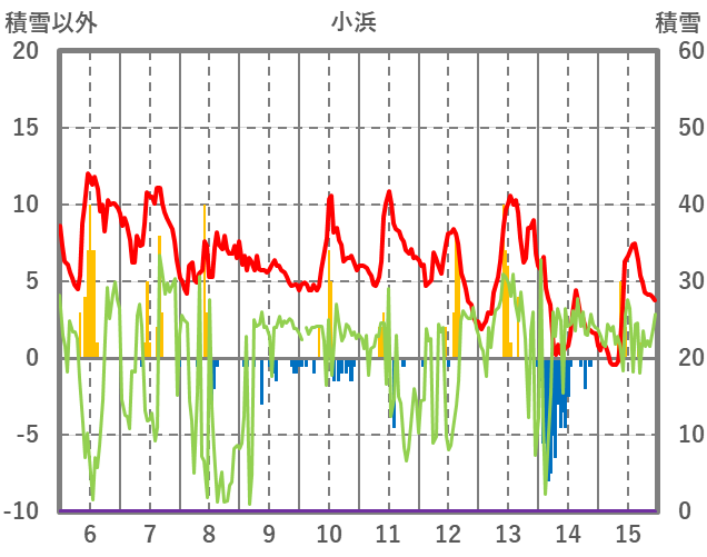 | 日 | 時 | 気温 | 降水 | 風向/風速 | 日照 | 積雪 | 降雪 |