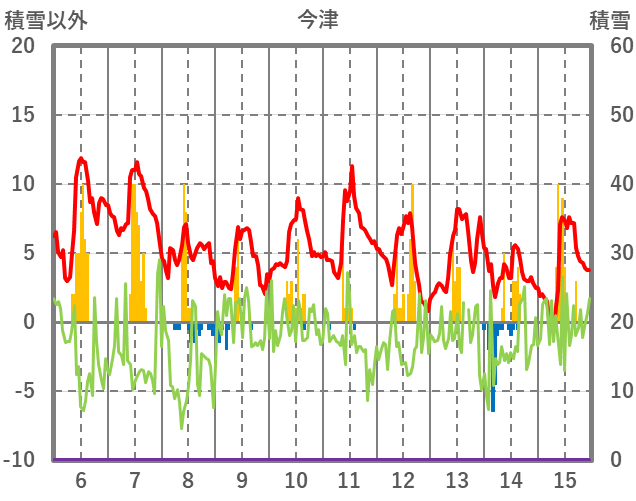 | 日 | 時 | 気温 | 降水 | 風向/風速 | 日照 | 積雪 | 降雪 |