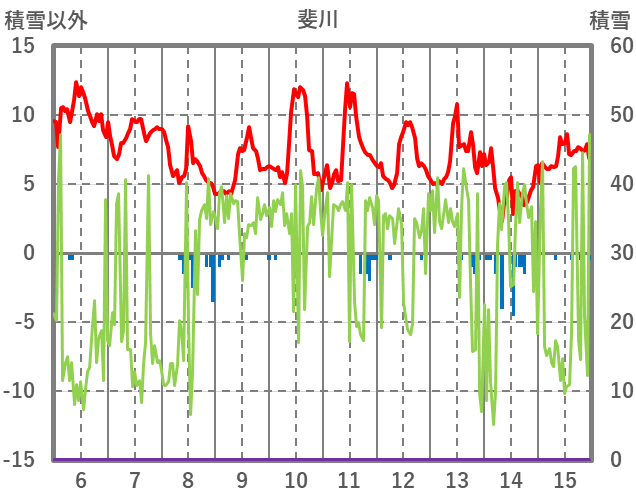 | 日 | 時 | 気温 | 降水 | 風向/風速 | 日照 | 積雪 | 降雪 |