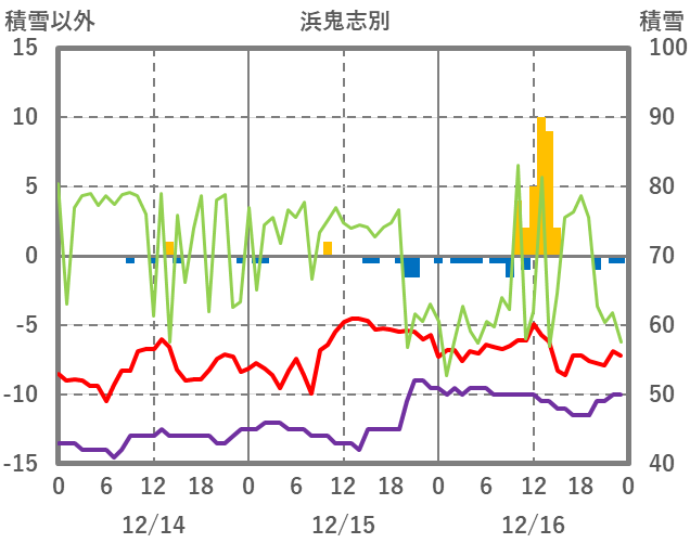 | 日 | 時 | 気温 | 降水 | 風向/風速 | 日照 | 積雪 | 降雪 |