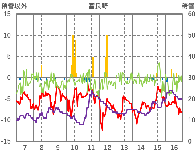 | 日 | 時 | 気温 | 降水 | 風向/風速 | 日照 | 積雪 | 降雪 |
