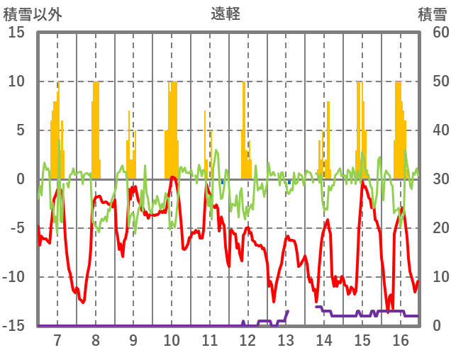 | 日 | 時 | 気温 | 降水 | 風向/風速 | 日照 | 積雪 | 降雪 |