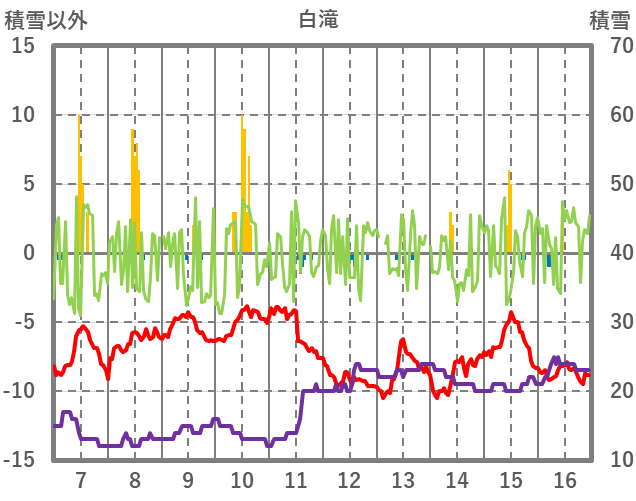 | 日 | 時 | 気温 | 降水 | 風向/風速 | 日照 | 積雪 | 降雪 |