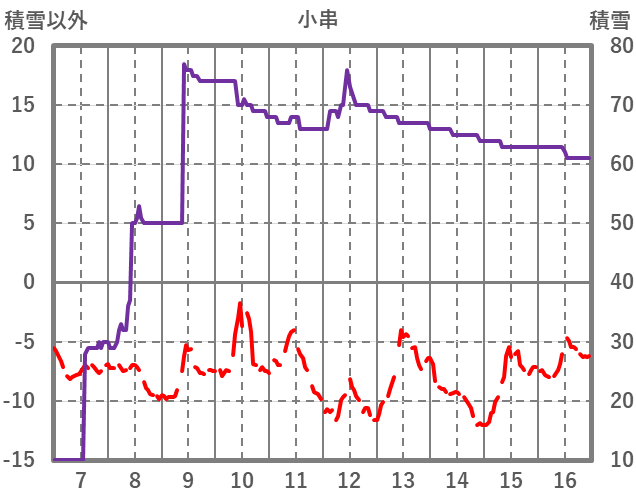 | 日 | 時 | 気温 | 降水 | 風向/風速 | 日照 | 積雪 | 降雪 |