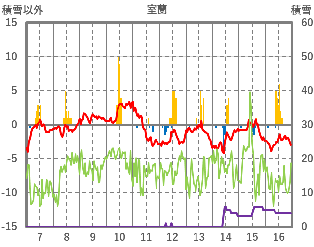 | 日 | 時 | 気温 | 降水 | 風向/風速 | 日照 | 積雪 | 降雪 |
