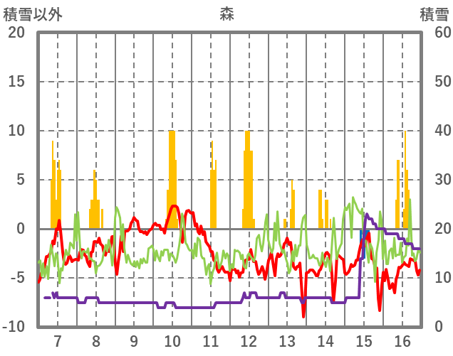 | 日 | 時 | 気温 | 降水 | 風向/風速 | 日照 | 積雪 | 降雪 |