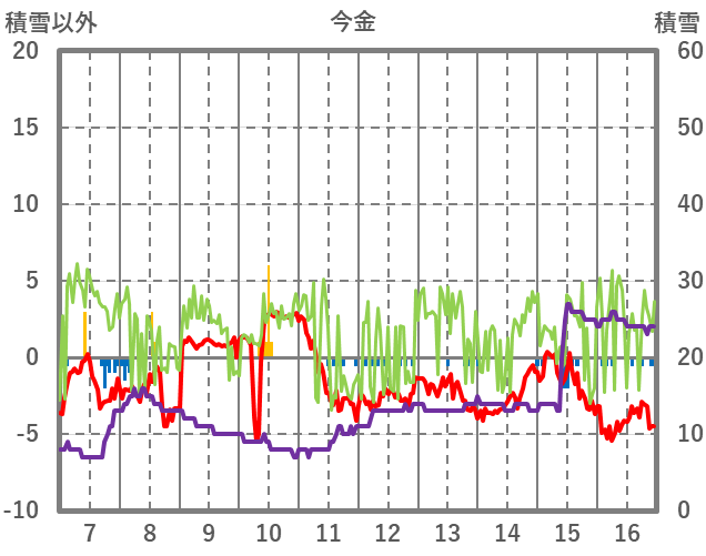 | 日 | 時 | 気温 | 降水 | 風向/風速 | 日照 | 積雪 | 降雪 |