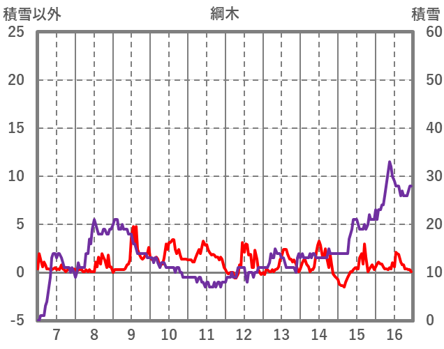 | 日 | 時 | 気温 | 降水 | 風向/風速 | 日照 | 積雪 | 降雪 |