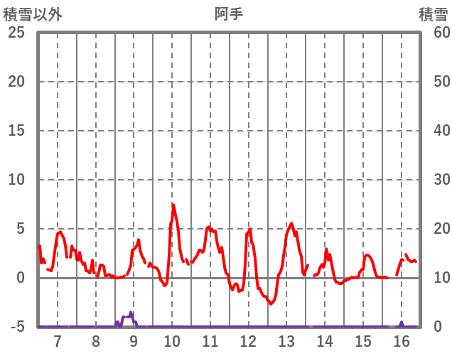 | 日 | 時 | 気温 | 降水 | 風向/風速 | 日照 | 積雪 | 降雪 |