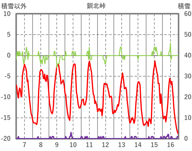 | 日 | 時 | 気温 | 降水 | 風向/風速 | 日照 | 積雪 | 降雪 |