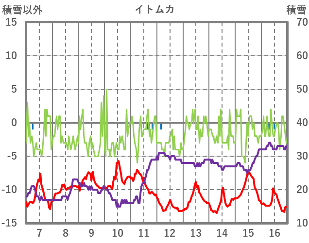 | 日 | 時 | 気温 | 降水 | 風向/風速 | 日照 | 積雪 | 降雪 |