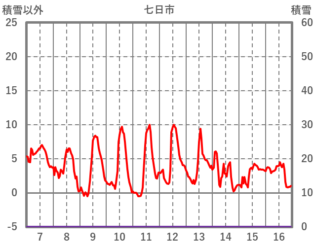 | 日 | 時 | 気温 | 降水 | 風向/風速 | 日照 | 積雪 | 降雪 |