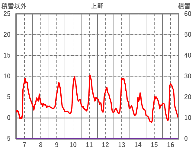 | 日 | 時 | 気温 | 降水 | 風向/風速 | 日照 | 積雪 | 降雪 |