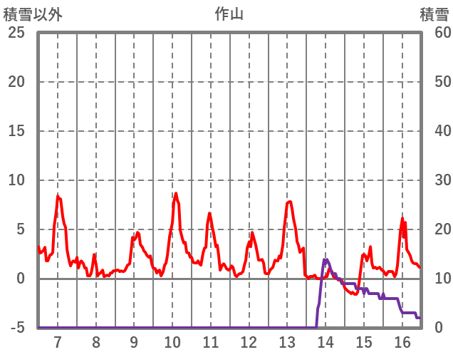 | 日 | 時 | 気温 | 降水 | 風向/風速 | 日照 | 積雪 | 降雪 |