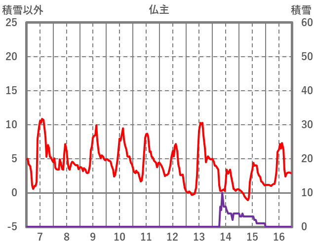 | 日 | 時 | 気温 | 降水 | 風向/風速 | 日照 | 積雪 | 降雪 |