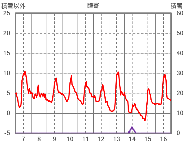 | 日 | 時 | 気温 | 降水 | 風向/風速 | 日照 | 積雪 | 降雪 |