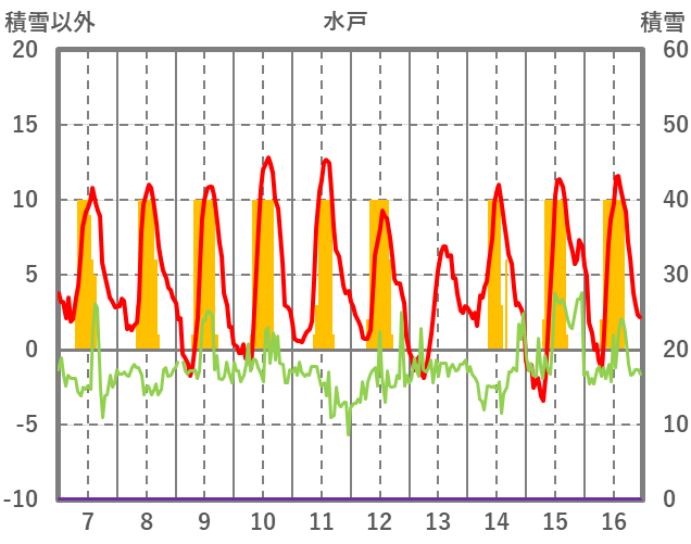 | 日 | 時 | 気温 | 降水 | 風向/風速 | 日照 | 積雪 | 降雪 |