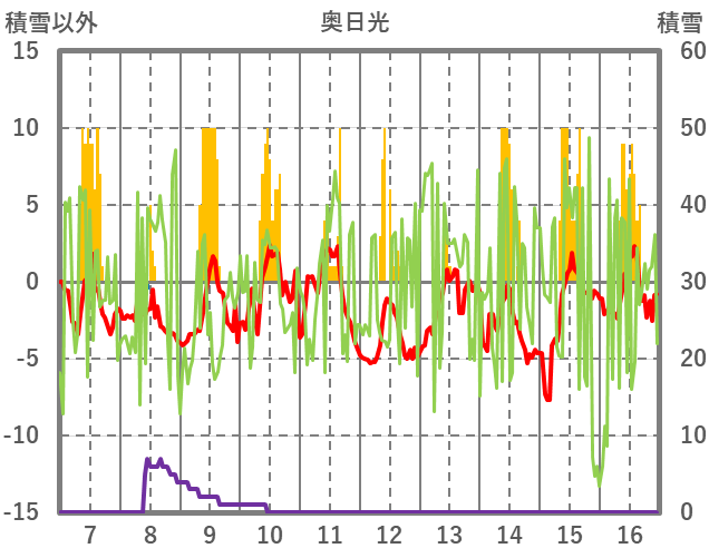 | 日 | 時 | 気温 | 降水 | 風向/風速 | 日照 | 積雪 | 降雪 |