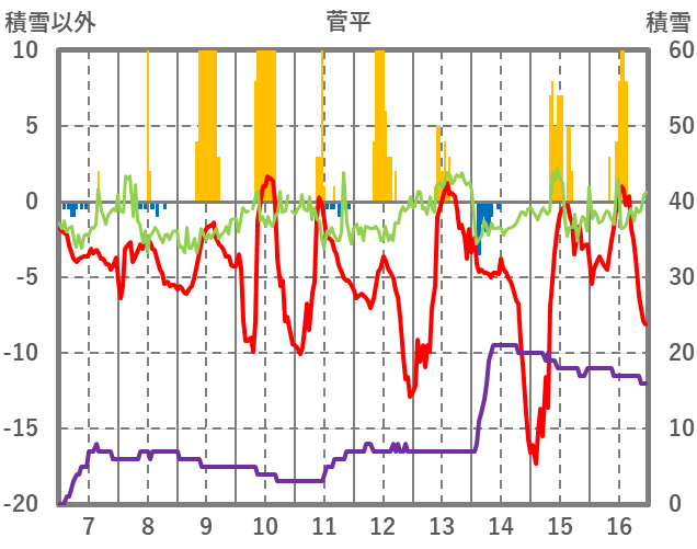 | 日 | 時 | 気温 | 降水 | 風向/風速 | 日照 | 積雪 | 降雪 |