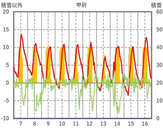 | 日 | 時 | 気温 | 降水 | 風向/風速 | 日照 | 積雪 | 降雪 |