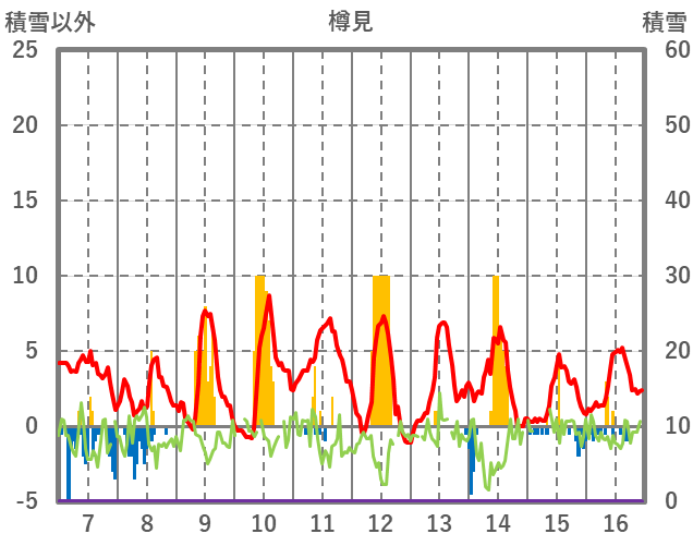 | 日 | 時 | 気温 | 降水 | 風向/風速 | 日照 | 積雪 | 降雪 |