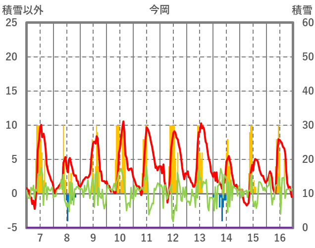 | 日 | 時 | 気温 | 降水 | 風向/風速 | 日照 | 積雪 | 降雪 |