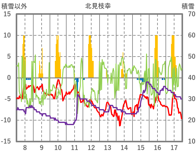 | 日 | 時 | 気温 | 降水 | 風向/風速 | 日照 | 積雪 | 降雪 |