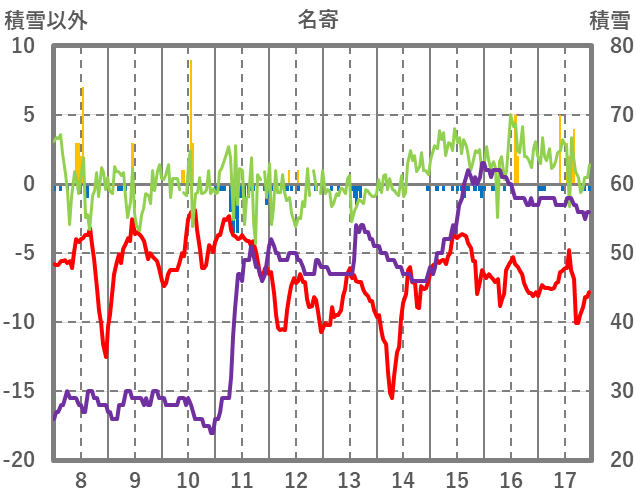 | 日 | 時 | 気温 | 降水 | 風向/風速 | 日照 | 積雪 | 降雪 |
