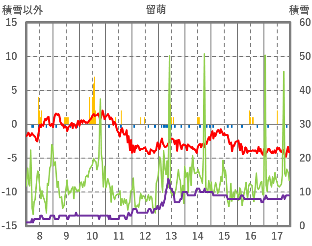| 日 | 時 | 気温 | 降水 | 風向/風速 | 日照 | 積雪 | 降雪 |