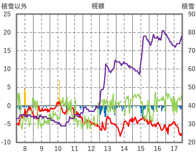 | 日 | 時 | 気温 | 降水 | 風向/風速 | 日照 | 積雪 | 降雪 |
