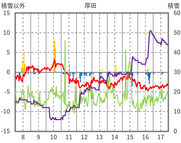 | 日 | 時 | 気温 | 降水 | 風向/風速 | 日照 | 積雪 | 降雪 |