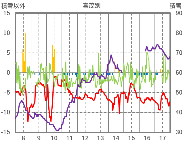 | 日 | 時 | 気温 | 降水 | 風向/風速 | 日照 | 積雪 | 降雪 |