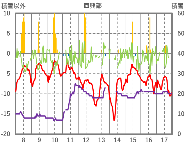 | 日 | 時 | 気温 | 降水 | 風向/風速 | 日照 | 積雪 | 降雪 |