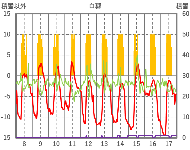 | 日 | 時 | 気温 | 降水 | 風向/風速 | 日照 | 積雪 | 降雪 |