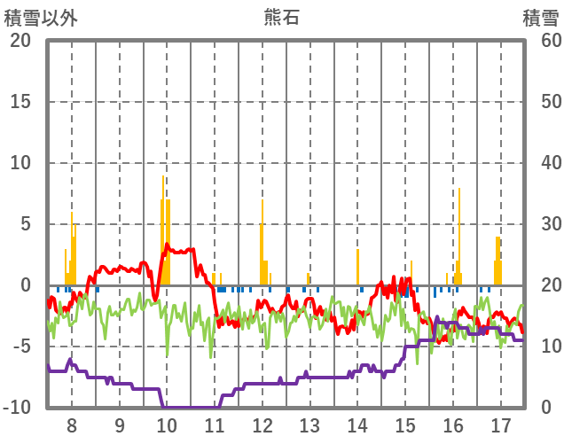 | 日 | 時 | 気温 | 降水 | 風向/風速 | 日照 | 積雪 | 降雪 |