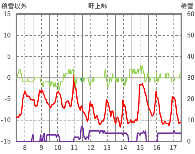 | 日 | 時 | 気温 | 降水 | 風向/風速 | 日照 | 積雪 | 降雪 |