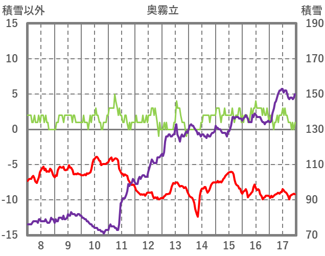 | 日 | 時 | 気温 | 降水 | 風向/風速 | 日照 | 積雪 | 降雪 |