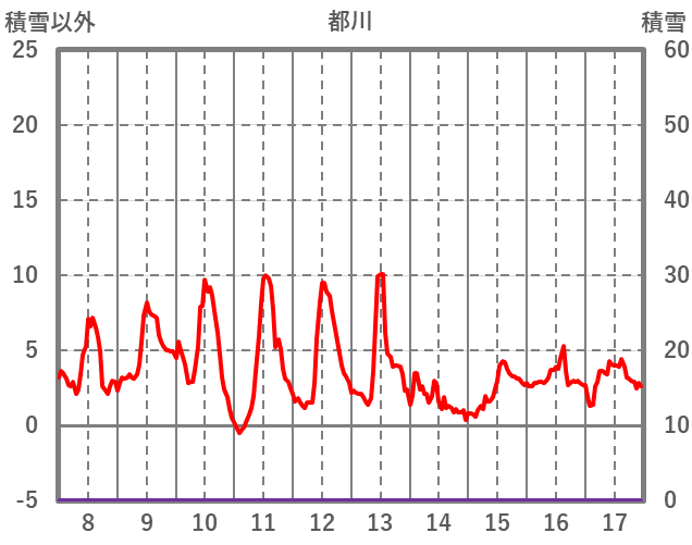 | 日 | 時 | 気温 | 降水 | 風向/風速 | 日照 | 積雪 | 降雪 |