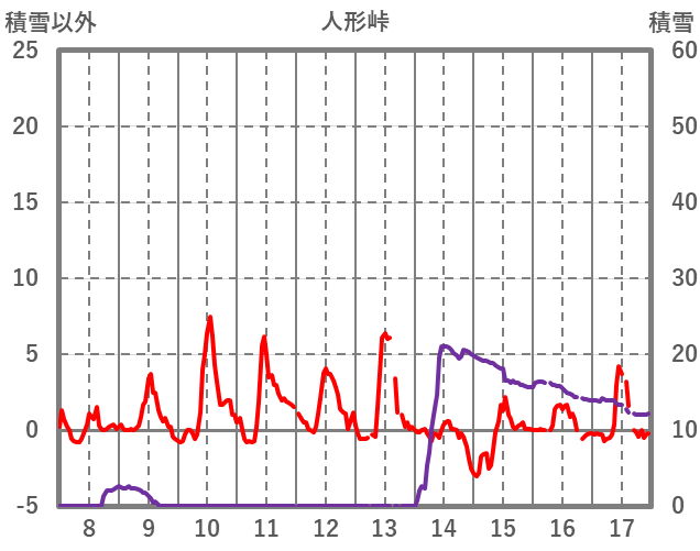 | 日 | 時 | 気温 | 降水 | 風向/風速 | 日照 | 積雪 | 降雪 |