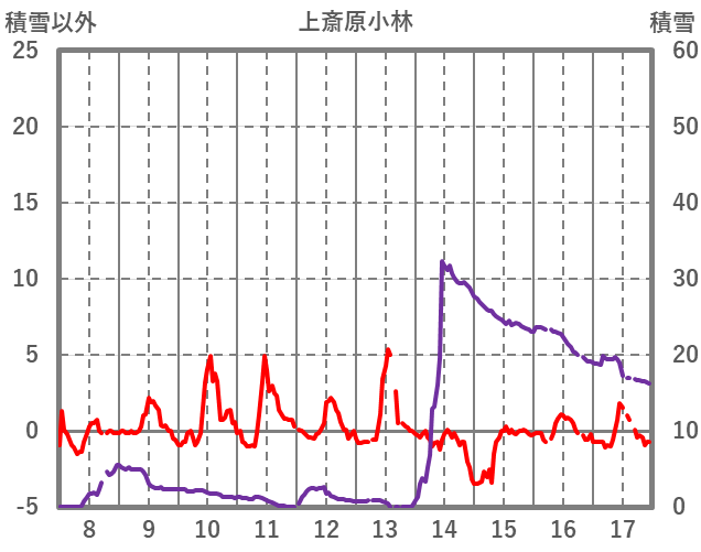 | 日 | 時 | 気温 | 降水 | 風向/風速 | 日照 | 積雪 | 降雪 |