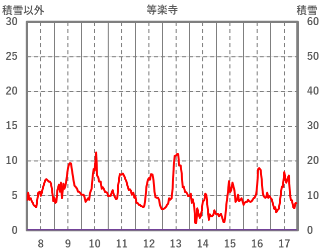 | 日 | 時 | 気温 | 降水 | 風向/風速 | 日照 | 積雪 | 降雪 |