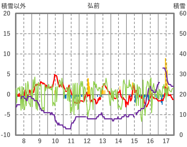 | 日 | 時 | 気温 | 降水 | 風向/風速 | 日照 | 積雪 | 降雪 |