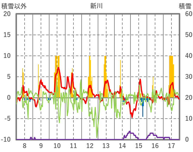 | 日 | 時 | 気温 | 降水 | 風向/風速 | 日照 | 積雪 | 降雪 |