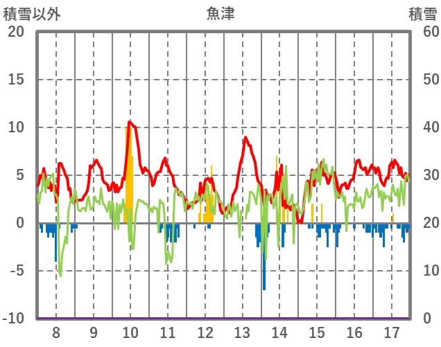 | 日 | 時 | 気温 | 降水 | 風向/風速 | 日照 | 積雪 | 降雪 |