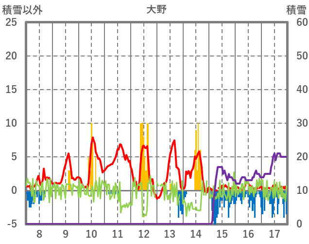 | 日 | 時 | 気温 | 降水 | 風向/風速 | 日照 | 積雪 | 降雪 |