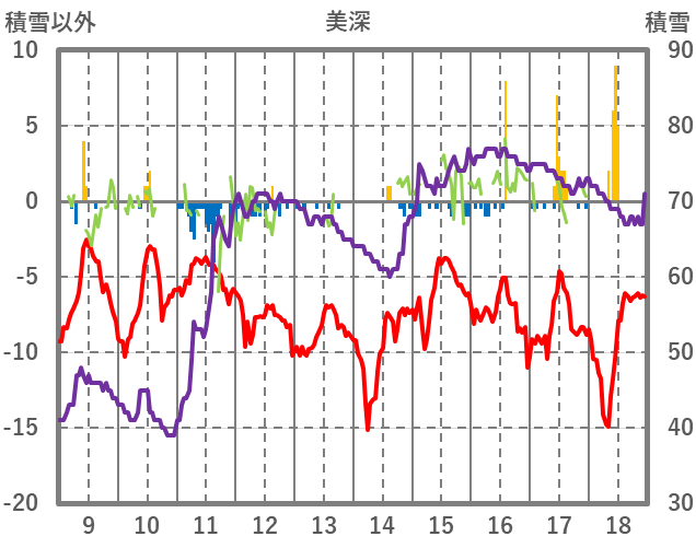 | 日 | 時 | 気温 | 降水 | 風向/風速 | 日照 | 積雪 | 降雪 |
