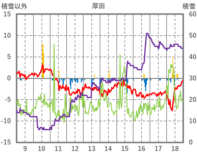 | 日 | 時 | 気温 | 降水 | 風向/風速 | 日照 | 積雪 | 降雪 |